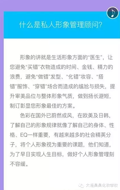 隨著前幾天成都90后美女整理衣櫥月薪過萬的新聞報道后,私人形象管理顧問課程越來越受到大家的喜愛,那么大連昊昊化妝做為東北******推出私人形象顧問管理課程的 ,收到廣大顧客的喜愛,越來越多的人關注到私人形象管理顧問的重要性,課程時間短,見效快,在***短時間內把***精湛的技術教得大家,想學的你趕快報名吧!報名熱線:15040444077
