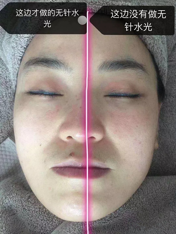 二 無針水光 :一次無針水光相當于8000次面膜,無針水光是通過儀器產生的氣壓將應用物質輸送到真皮層,整個過程儀器不會接觸到皮膚,因此不會產生疼痛感,相比有針水光安全性更高。